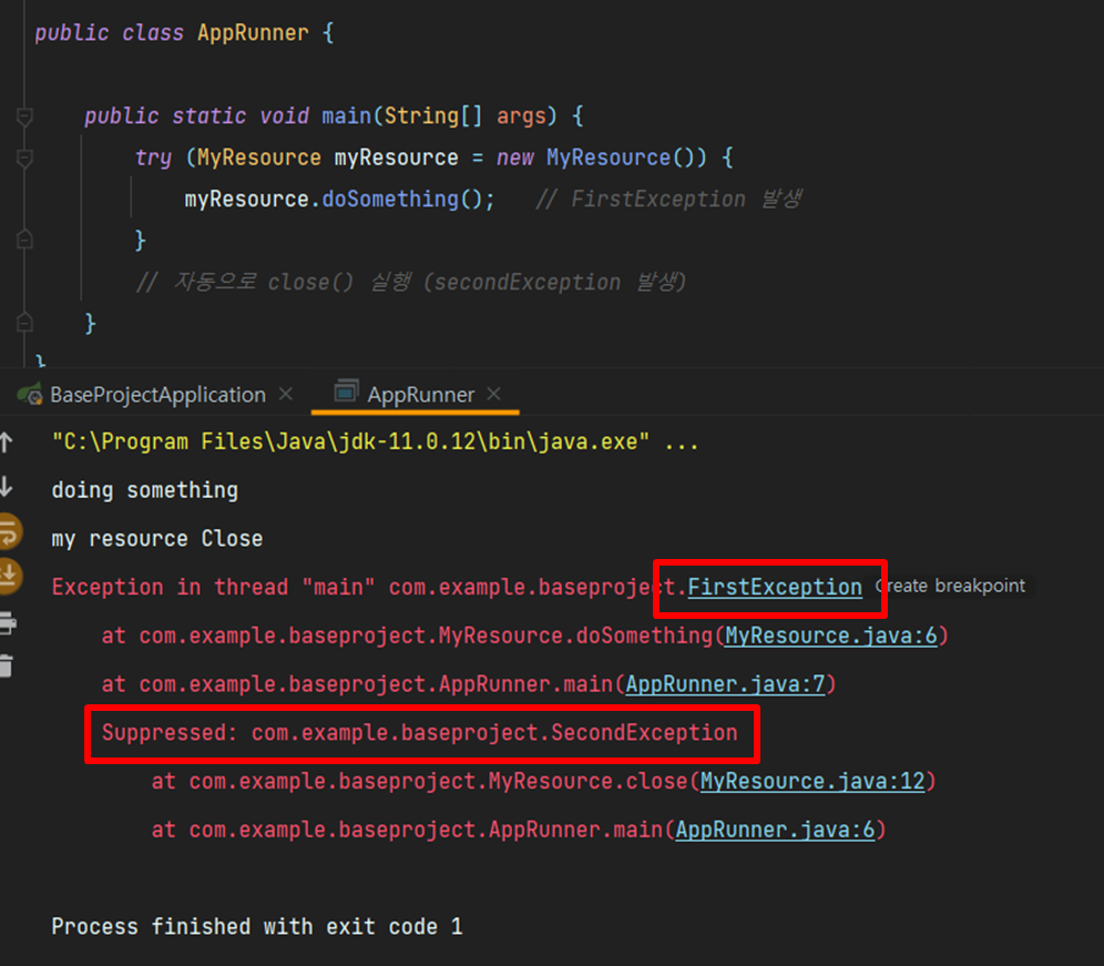 FirstExceprion, SecondException 클래스는 그대로 두고 다음과 같이 MyResource 클래스에서 AutoCloseable 인터페이스 implement 하고 close 메서드를 오버라이드 하였습니다.